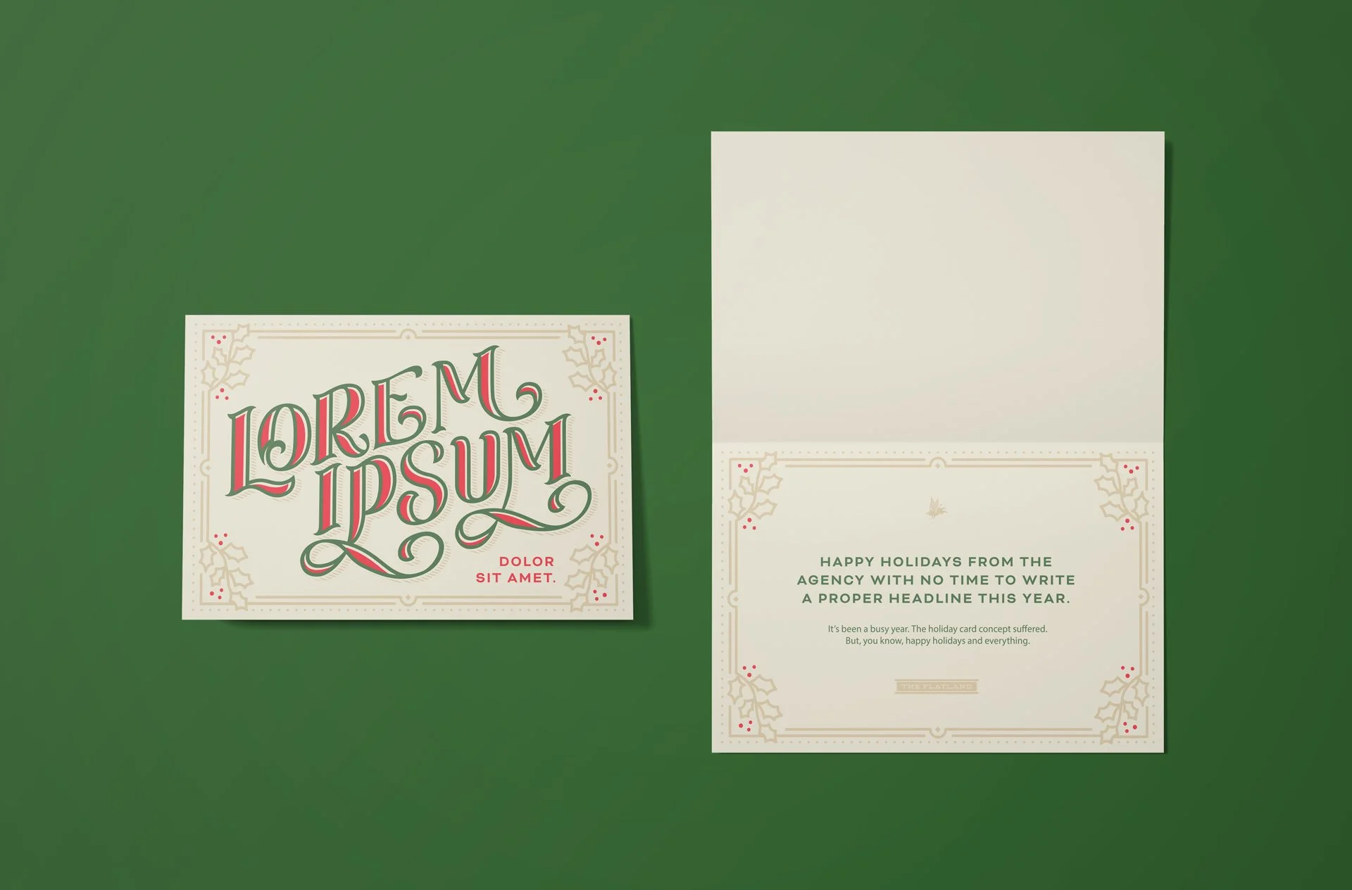 My concept for this year’s agency Christmas card was to quite literally “phone it in.” The humor came from the contrast—pairing high production value with deliberately irreverent messaging. The card claimed we didn’t have time to make a proper card, using standard greeking placeholder copy, but presented it in an ornate, hand-lettered style typical of a traditional Christmas card.